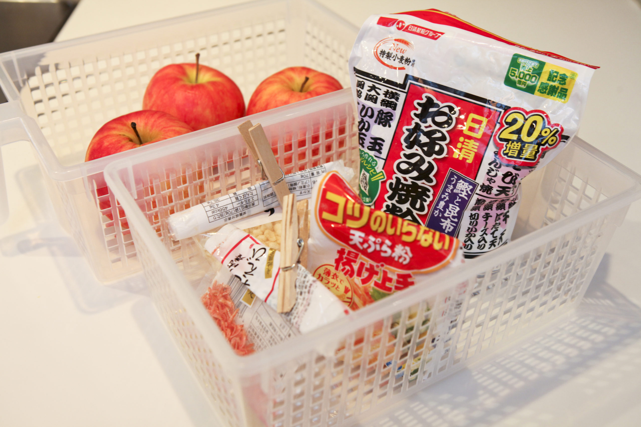 例えばお好み焼きセットには、お好み焼の粉や桜えび、天かす、青のりなどをいれておきます。そうすると「あれ桜エビどこやったっけ?なかったかもしれないから買っておこう」と無駄買いも防ぐことができます。